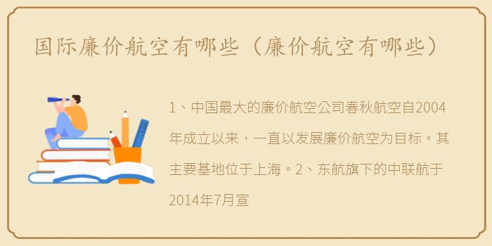1、中国最大的廉价航空公司春秋航空自2004年成立以来,一直以发展廉价航空为目标。其主要基地位于上海。2、东航旗下的中联航于2014年7月宣布战略转型,从而成为国内首家国企转型的廉价航空公司。3、成都航空总部。