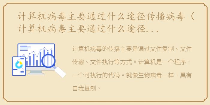 计算机病毒的传播主要是通过文件复制、文件传输、文件执行等方式。计算机是一个程序,一个可执行的代码。就像生物病毒一样,具有自我复制、相互感染、激活和再生的特性。目前主要有以下几种:通过u盘/移动硬盘传播;通过电子邮件传播;通过网页传播;通过聊天工具和下载的软件传播。
