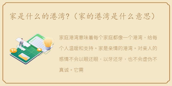 家庭港湾意味着每个家庭都像一个港湾,给每个人温暖和支持。家是亲情的港湾。对亲人的感情不会以眼还眼,以牙还牙,也不会虚伪不真诚。它需要真诚的爱和无私的爱,而不是平等的交换。