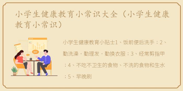 小学生健康教育小贴士1、饭前便后洗手;2、勤洗澡,勤理发,勤换衣服;3、经常剪指甲;4、不吃不卫生的食物、不洗的食物和生水;5、早晚刷牙,饭后漱口。