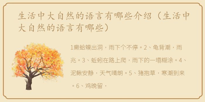 1癞蛤蟆出洞,雨下个不停。2、龟背潮,雨兆。3、蚯蚓在路上爬,雨下的一塌糊涂。4、泥鳅安静,天气晴朗。5、猪抱草,寒潮到来。6、鸡晚留,鸭欢啼,风雨将至。7、云下山,地却胜不要这样做。8、云扭雨淋。9、乌云扶起司机,如果它it’今天不是阴天。我要下去了。10、云低为雨,云高为晴。11、,天高云淡,河水涨了十尺。