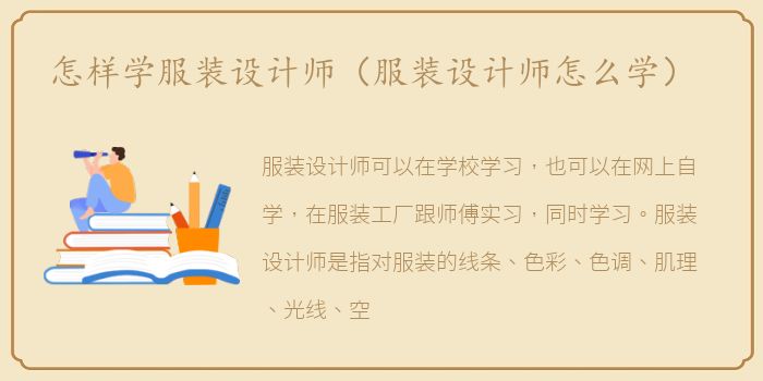 服装设计师可以在学校学习,也可以在网上自学,在服装工厂跟师傅实习,同时学习。服装设计师是指对服装的线条、色彩、色调、肌理、光线、空间进行艺术表现和结构造型的人。服装的款式一定要靠线条来完成,比如开口、缝线、连扣等。都是服装上的线条。