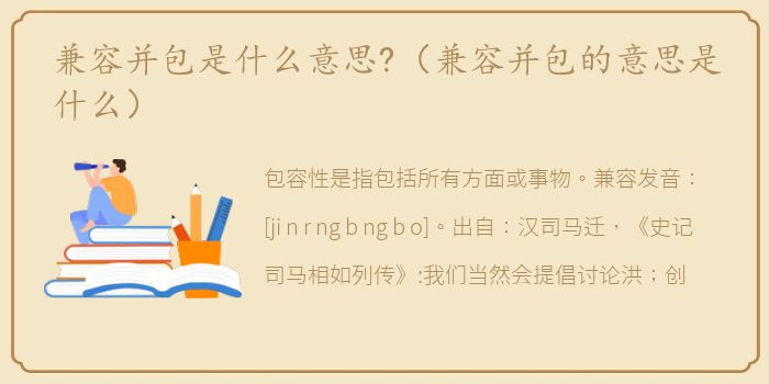 包容性是指包括所有方面或事物。兼容发音:[ji n r ng b ng b o]。出自:汉司马迁,《史记司马相如列传》:我们当然会提倡讨论洪;创造传统;为了世界的规则。所以兼容并包;又勤快又体贴。"