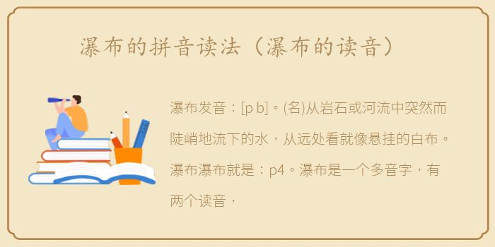 瀑布发音:[p b]。(名)从岩石或河流中突然而陡峭地流下的水,从远处看就像悬挂的白布。瀑布瀑布就是:p4。瀑布是一个多音字,有两个读音,分别是宝和普。