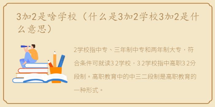2学校指中专、三年制中专和两年制大专,符合条件可就读3/2学校,3/2学校指中高职3/2分段制。高职教育中的中三二段制是高职教育的一种形式。部分重点中专和高等职业技术学院经省有关部门批准举办和招收应届初中毕业生,学制五年。毕业后,他们将被送到省教育厅获得大专文凭。前三年按学校标准收费,后两年按学院标准收费。