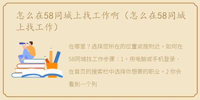 在哪里?选择您所在的位置或按附近。如何在58同城找工作步骤:1。用电脑或手机登录,在首页的搜索栏中选择你想要的职业。2.你会看到一个列表,选择你感兴趣的点进去。3.根据申请的职位制作简历。4.填写完信息后,按立即发货。