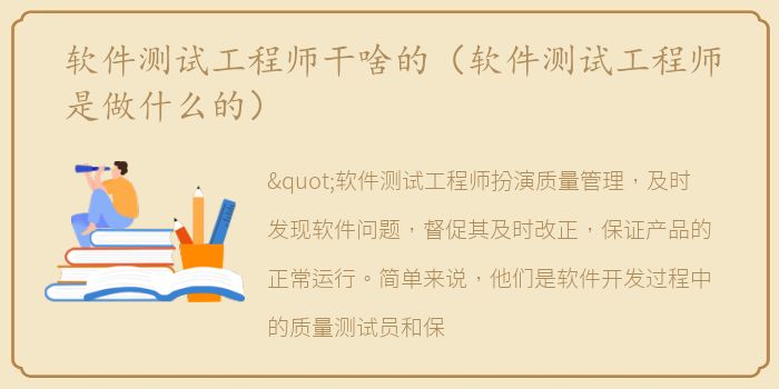 "软件测试工程师扮演质量管理,及时发现软件问题,督促其及时改正,保证产品的正常运行。简单来说,他们是软件开发过程中的质量测试员和保障员,负责软件质量的把关。"