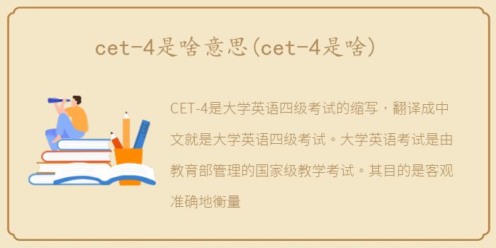 CET-4是大学英语四级考试的缩写,翻译成中文就是大学英语四级考试。大学英语考试是由教育部管理的国家级教学考试。其目的是客观准确地衡量大学生的实际英语能力,为大学英语教学提供服务。