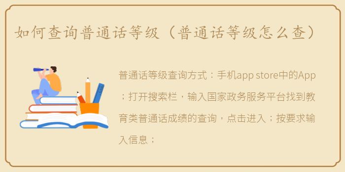 普通话等级查询方式:手机app store中的App;打开搜索栏,输入国家政务服务平台找到教育类普通话成绩的查询,点击进入;按要求输入信息;点击查询,可以看到显示的结果。你可以拨打我考普所在地的普通话测试中心的电话。普通话水平测试等级证书由国家语委统一印制。