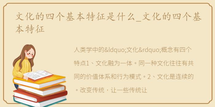 人类学中的“文化”概念有四个特点1、文化融为一体。同一种文化往往有共同的价值体系和行为模式。2、文化是连续的。改变传统,让一些传统让位,也是很难的。3、文化是变化和积累的产物。4、文化是普遍的。无论古今中外,人存在的地方都是方便的,都是有文化的。