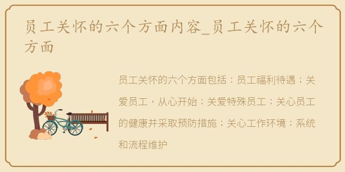 员工关怀的六个方面包括:员工福利待遇;关爱员工,从心开始;关爱特殊员工;关心员工的健康并采取预防措施;关心工作环境;系统和流程维护。员工是企业生存的基础。一个企业要想成功,必须从关爱员工开始!