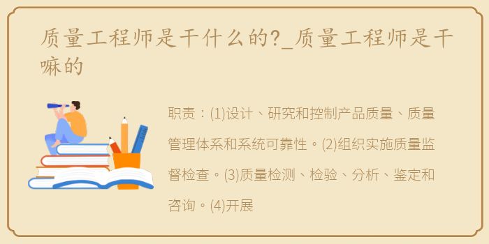 职责:(1)设计、研究和控制产品质量、质量管理体系和系统可靠性。(2)组织实施质量监督检查。(3)质量检测、检验、分析、鉴定和咨询。(4)开展产品认证、生产许可、体系认证、审核员和评审员注册、质检机构和实验室评审等合格评定管理。(5)调解质量纠纷,组织重大质量事故的调查分析。