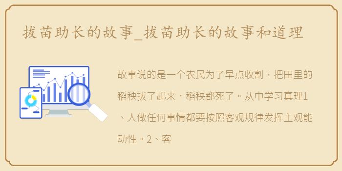 故事说的是一个农民为了早点收割,把田里的稻秧拔了起来,稻秧都死了。从中学习真理1、人做任何事情都要按照客观规律发挥主观能动性。2、客观事物的发展有其自身的规律。