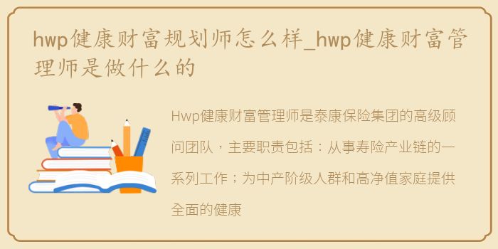 Hwp健康财富管理师是泰康保险集团的高级顾问团队,主要职责包括:从事寿险产业链的一系列工作;为中产阶级人群和高净值家庭提供全面的健康和财富管理服务;在养老、健康、财富领域,从事大健康相关工作。