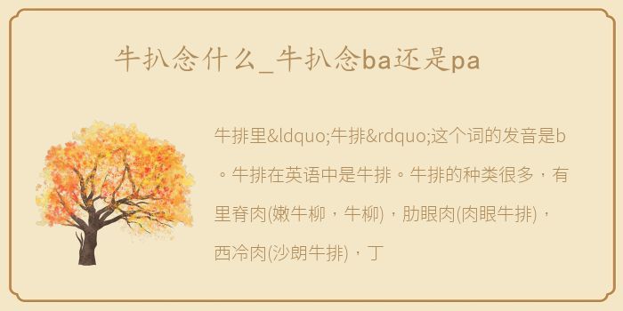 牛排里“牛排”这个词的发音是b。牛排在英语中是牛排。牛排的种类很多,有里脊肉(嫩牛柳,牛柳),肋眼肉(肉眼牛排),西冷肉(沙朗牛排),丁字牛排。牛排是一种西餐。