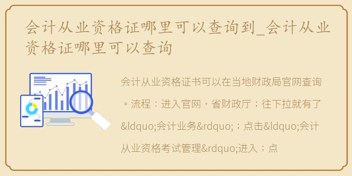 会计从业资格证书可以在当地财政局官网查询。流程:进入官网,省财政厅;往下拉就有了“会计业务”;点击“会计从业资格考试管理”进入;点击“会计从业资格证书查询”进入;“XX省会计证继续教育及归属查询”可根据提示输入个人信息。