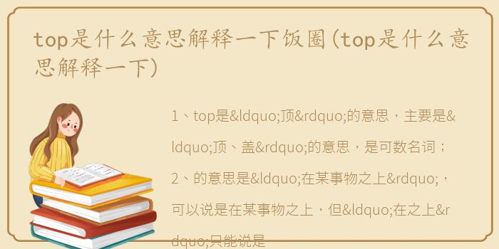 1、top是“顶”的意思,主要是“顶、盖”的意思,是可数名词;2、的意思是“在某事物之上”,可以说是在某事物之上,但“在之上”只能说是在之上;3、top的复数含义通常是“外套(用于西装和睡衣)”和“叶子(用于块根类蔬菜)”。