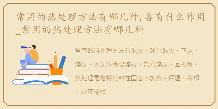 常用的热处理方法有退火、球化退火、正火、淬火、贝氏体等温淬火、盐浴淬火、回火等。热处理是指将材料在固态下加热、保温、冷却,以获得预期的组织和性能的金属热加工过程。