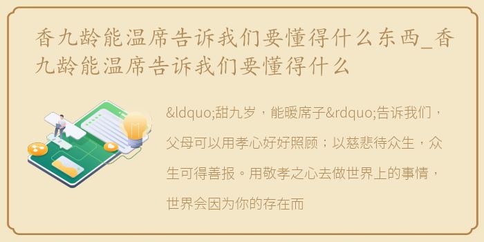 “甜九岁,能暖席子”告诉我们,父母可以用孝心好好照顾;以慈悲待众生,众生可得善报。用敬孝之心去做世界上的事情,世界会因为你的存在而变得特别美好。