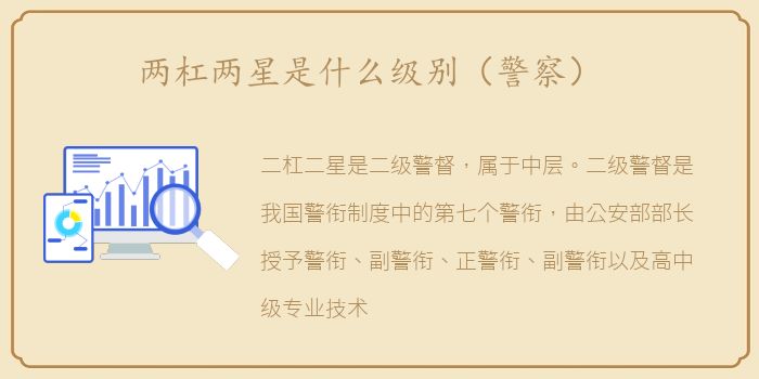 二杠二星是二级警督,属于中层。二级警督是我国警衔制度中的第七个警衔,由公安部部长授予警衔、副警衔、正警衔、副警衔以及高中级专业技术职务的警官。现在的标准衫是浅蓝色,标有两个银条和两个四角星。