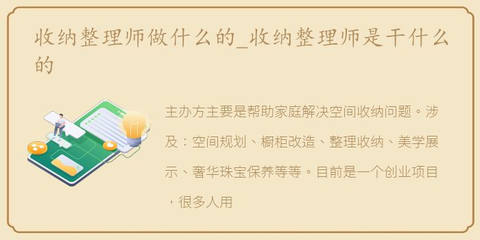 整理师又称衣柜整理师,是通过颜色款式和诊断为顾客整理衣柜,然后陪顾客选购适合自己的衣服的专业指导顾问。整理师是通过与客户的深入沟通,为客户提供家居整理、收纳解决方案和服务的专业人士。