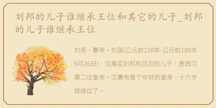 刘英,惠帝。刘英(公元前210年-公元前188年9月26日),汉高祖刘邦和吕后的儿子,是西汉第二位皇帝。汉惠帝是个年轻的皇帝,十六岁就继位了。