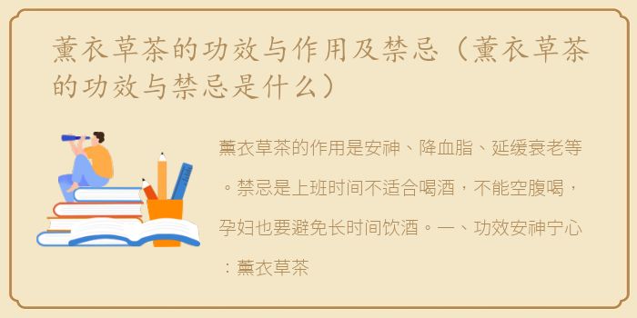 薰衣草茶的作用是安神、降血脂、延缓衰老等。禁忌是上班时间不适合喝酒,不能空腹喝,孕妇也要避免长时间饮酒。