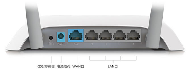 1、使用网线将宽带调制解调器(宽带猫)与无线路由器的WAN端口连接。路由器端口的示意图如下: