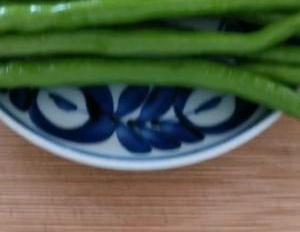 锅中油烧至5成热,倒入处理好的辣椒圈,用铲子轻轻按压一下,将辣椒铺平,然后再用小火慢煎。煎的时候我们轻轻晃动炒锅,使辣椒底部受热均匀,以免糊锅。