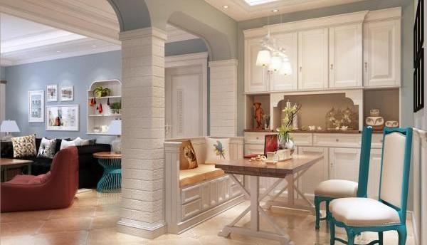 设计:蓝色和白色也可以是田园风格的体现。电视墙文化石和木质电视柜,以田园风格传递着独特的质感和休闲的居住环境。餐厅独特的摊位打破了原有餐厅的条条框框,整个空间更有一种闲适的味道。
