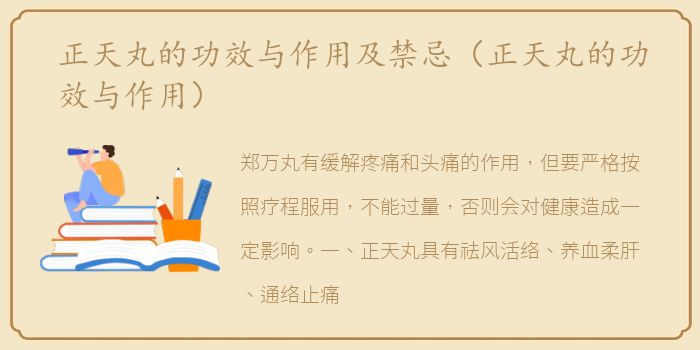 郑万丸有缓解疼痛和头痛的作用,但要严格按照疗程服用,不能过量,否则会对健康造成一定影响。一、正天丸具有祛风活络、养血柔肝、通络止痛等功效。