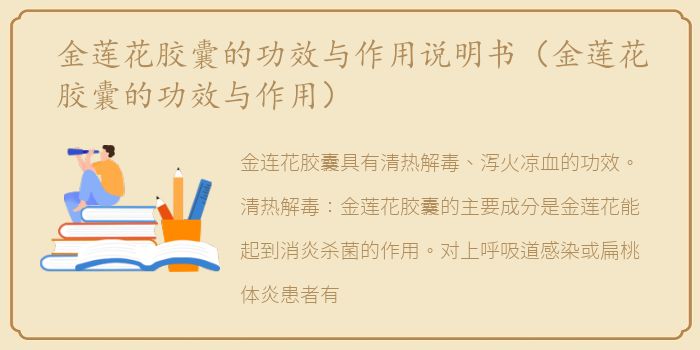 金连花胶囊具有清热解毒、泻火凉血的功效。清热解毒:金莲花胶囊的主要成分是金莲花能起到消炎杀菌的作用。
