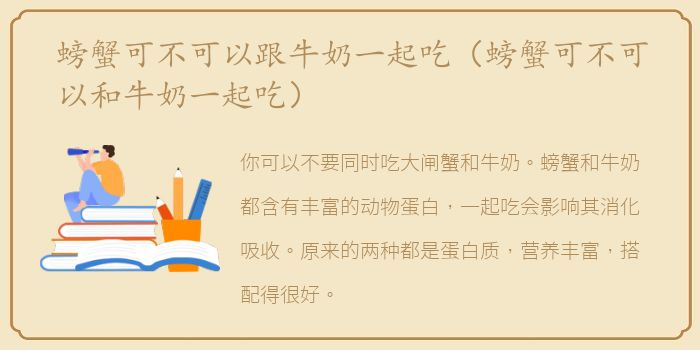 你可以不要同时吃大闸蟹和牛奶。螃蟹和牛奶都含有丰富的动物蛋白,一起吃会影响其消化吸收。
