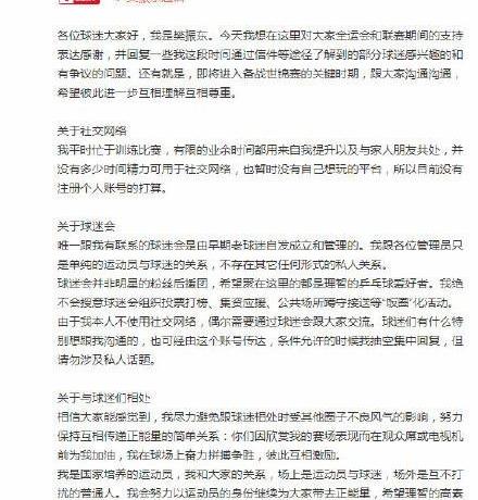 在他的帖子中,他说粉丝协会不是明星球迷后援团,这里的球迷都希望做理性的乒乓球爱好者。"希望理性优质的球迷能见证运动员樊振东的成长,而不是关注普通樊振东在赛场外的日常生活,窥探我正常的训练生活."