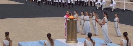 仪式的最后一名火炬手是希腊越野滑雪运动员、冬季两项运动员帕拉斯克维亚都普卢(Paraskevi Yadoplu),这位即将年满43岁的老将仍在赛场上奋战,已经获得了北京冬奥会越野滑雪的参赛资格。亚普鲁接过火炬后,跑到两位女祭司旁边的火种盆前,点燃火种盆,完成了火炬传递。