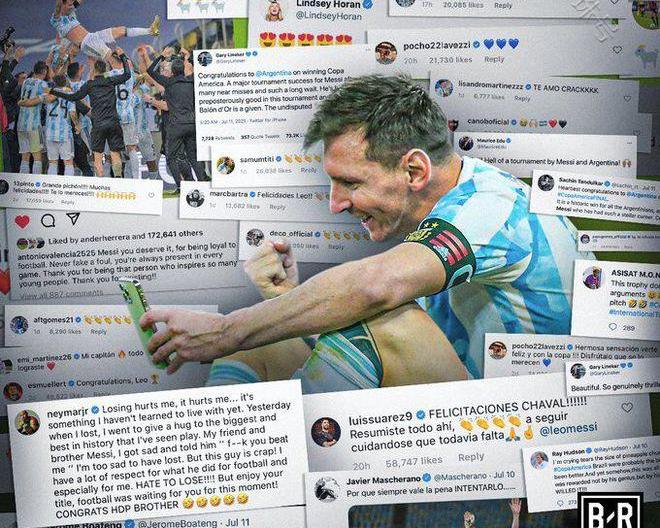 梅西他对对手的尊重使他多年来得到了世界足坛的广泛认可。梅西第一次获得国家队冠军后,大批从未和他做过队友的人发来贺电。最典型的代表就是前拜仁中后卫博阿滕。博阿滕曾经是梅西 犯罪般的过分行为,但他第一个祝贺阿根廷队夺冠。
