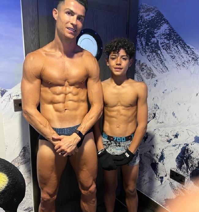 父子俩都只穿内衣。有球迷说:c罗是大家都熟悉的肌肉,但它让人意想不到的是,12岁的迷你c罗也有明显的腹肌。你如何练习这个?