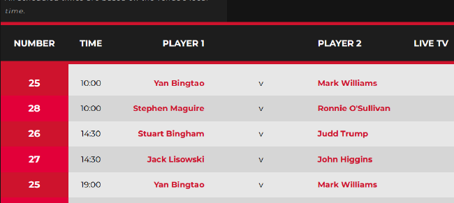 2022年斯诺克世界锦标赛第11比赛日赛程