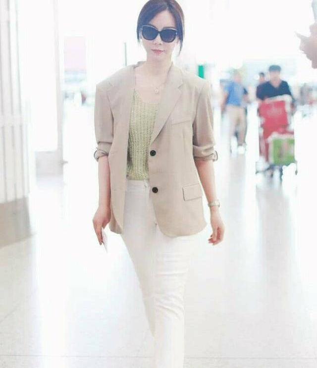 从照片中,你可以看到陈数穿着浅绿色西装外套,白色直筒裤和黑色太阳镜。虽然简单中透着舒适自然,但却展现了陈数的时尚气质,尤其是随意扎的低马尾,更显知性干练。