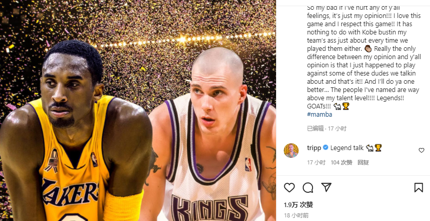 贾森威廉姆斯在Ins上写道:上周,我对科比的评论引起了争议。我看到了你的评论,有正面的,也有负面的。有些人对我的评论很生气,这意味着你在乎。来,让我解释一下。首先,科比是湖人历史上最伟大的球员。那个时候,我们谈论的是所有最伟大的NBA球员,他们至少有一个赛季穿着湖人队的球衣。我我不是在谈论最伟大的湖人,因为当然。