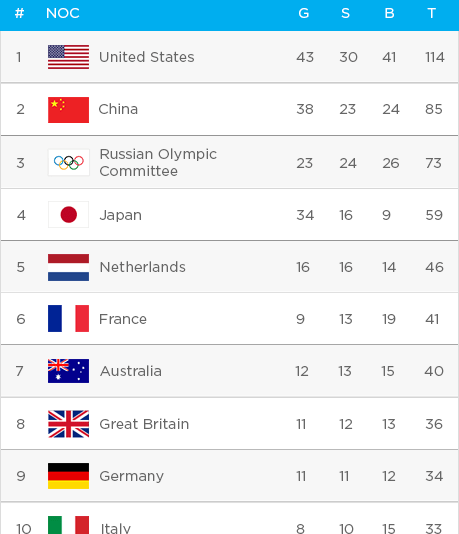 此外,Gracenote的预期几乎和之前一样,美国和中国仍然占据前两名。荷兰是另一支明显高于大多数人预期的球队,他们稳坐第五。英国队的表现看起来远低于第二名和五年前在里约热内卢获得的67枚奖牌。